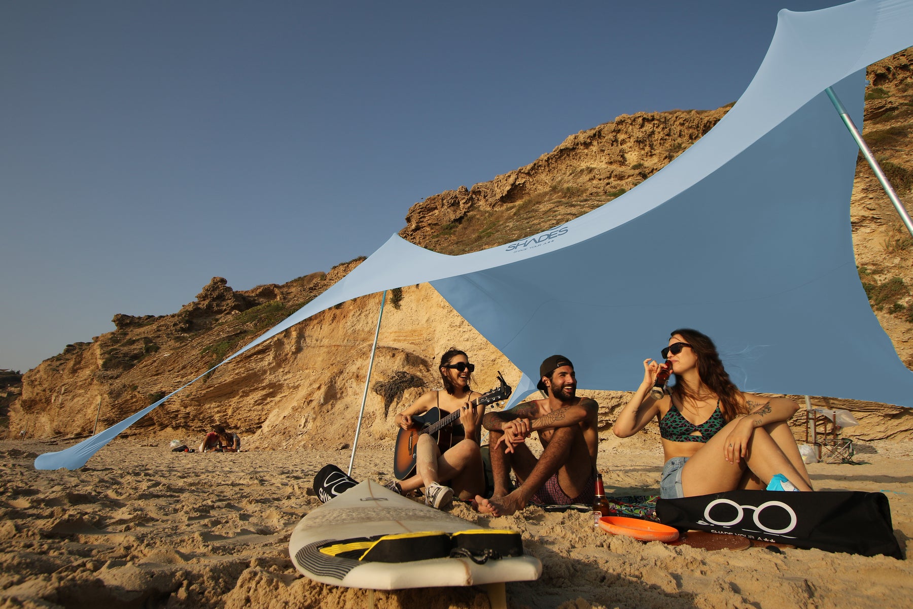 הציליה של SHADES מעניקה הגנה של 95%-97% בפני קרני UV. הצלון מיוצר בישראל מבד לייקרה איכותי תוצרת איטליה. קל לנשיאה, הרכבה פשוטה ומהירה, הצללה אסתטית ומעוצבת כולל תיק נשיאה קומפקטי